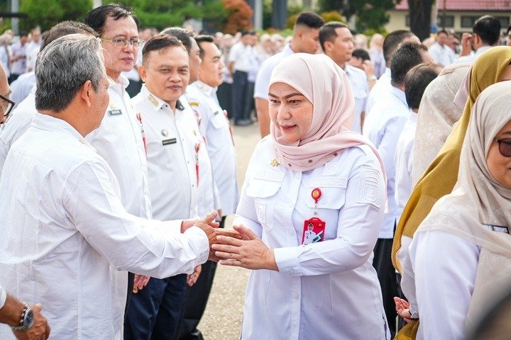 Wali Kota Banjarbaru, Hj. Erna Lisa Halaby bersalaman dengan ASN usai apel bersama. Foto – MC Banjarbaru untuk Mediakita.co.id
