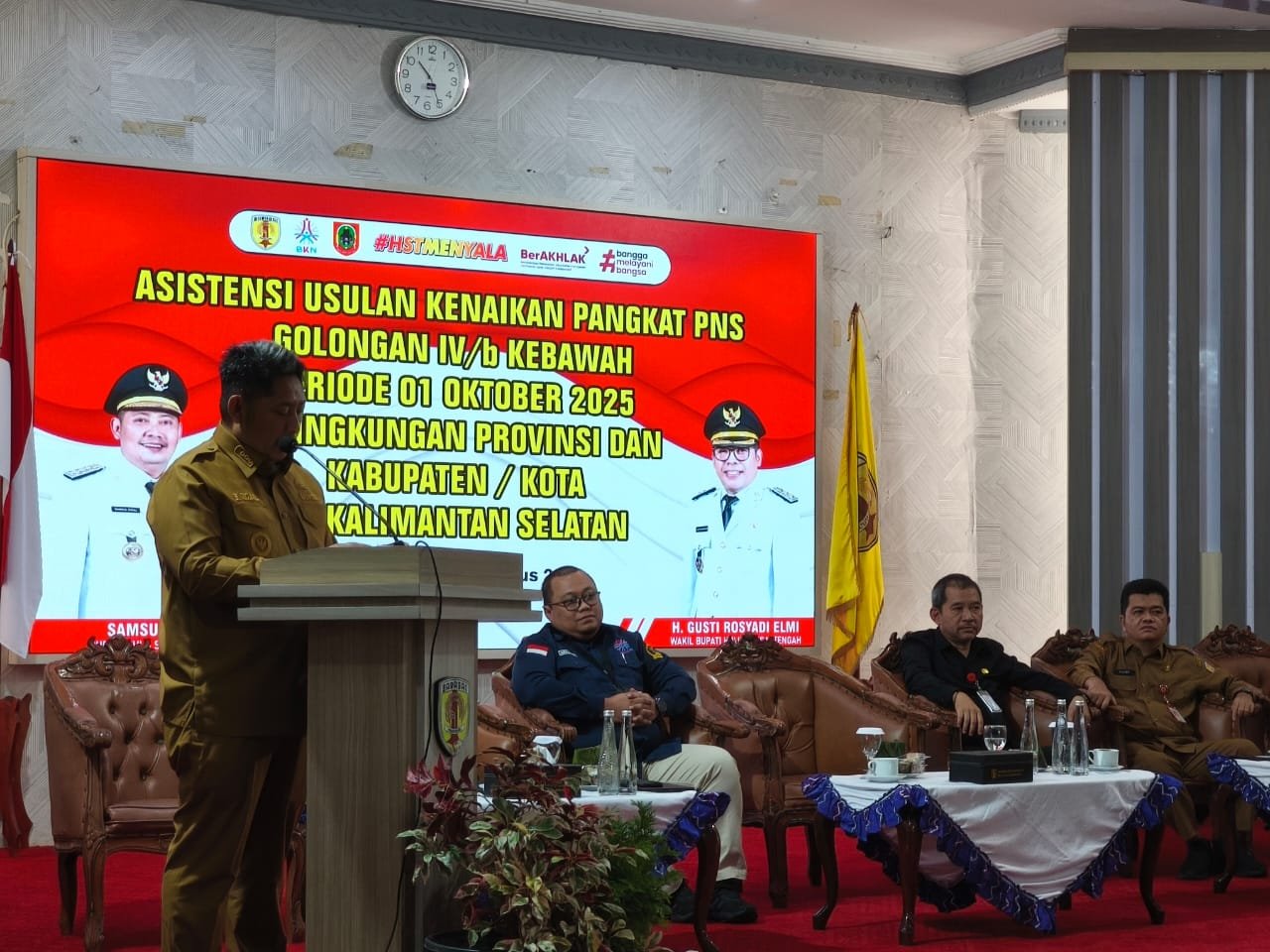 MEDIAKITA.CO.ID – Bupati Hulu Sungai Tengah (HST) Samsul Rizal secara resmi membuka kegiatan Asistensi Usulan Kenaikan Pangkat PNS Golongan IV/b ke bawah Periode 01 Oktober 2025 di lingkup Provinsi dan Kabupaten/Kota se-Kalimantan Selatan. Kegiatan ini digelar di Pendopo Bupati HST, Barabai, Selasa (12/8/2025). Kegiatan ini diikuti oleh perwakilan Badan Kepegawaian Daerah (BKD) dari seluruh daerah se-Kalsel.