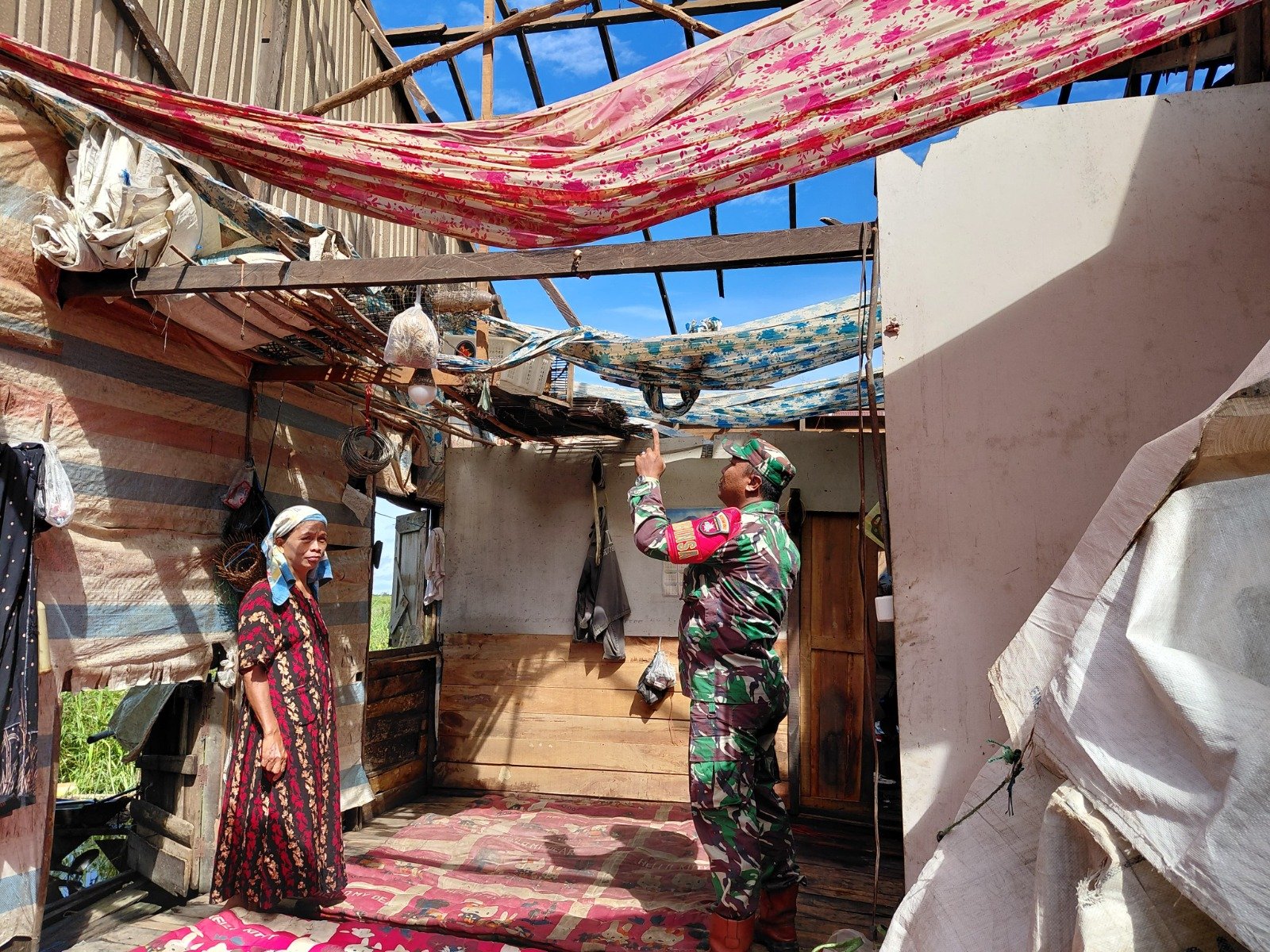 Babinsa Koramil 1002-05/Pandawan saat menyambangi rumah warga yang terdampak bencana. Foto – Istimewa