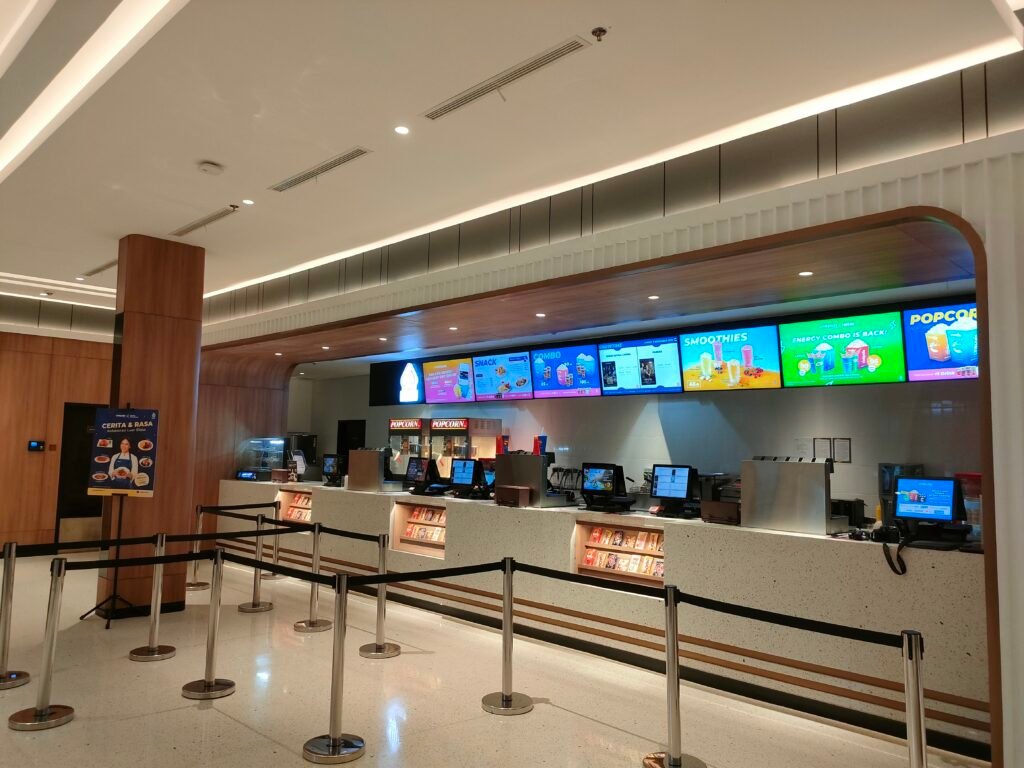 Dari sisi interior, bioskop ini mengusung desain modern dengan lobi luas, lounge area, dan concession area yang tertata rapi. Kesan premium dihadirkan melalui tata cahaya dan pemilihan material yang nyaman dipandang.