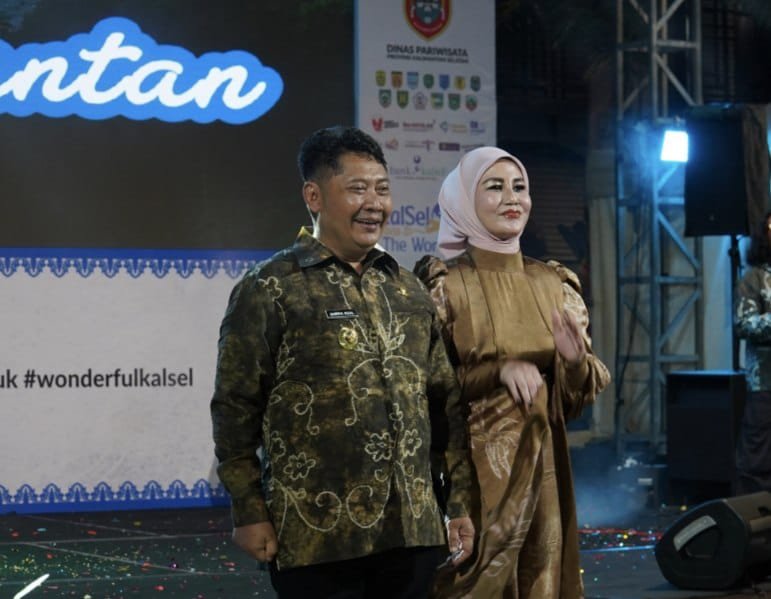 Ketua Dekranasda Kabupaten HST, Deni Era Yulyanti saat tampil bersama Bupati HST, Samsul Rizal di Fashion show CoE Jogyakarta. Foto – Istimewa