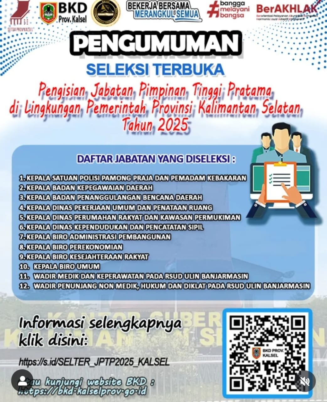 Dalam laman BKD.Kalselprov.go.id mengumumkan seleksi sejumlah jabatan kosong diantaranya :