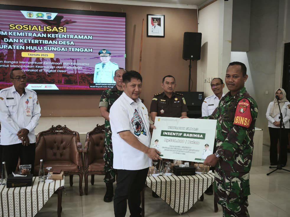 Sebagai bentuk dukungan nyata, Pemerintah Kabupaten HST telah menetapkan Peraturan Bupati Nomor 21 Tahun 2025 tentang Pedoman Penyusunan APBDes Tahun Anggaran 2025, yang mengatur pemberian insentif kepada aparat keamanan desa. Babinsa dan Bhabinkamtibmas masing-masing akan menerima insentif sebesar Rp.500.000 per bulan per desa, sementara Satlinmas desa mendapat insentif sebesar Rp.150.000 per bulan yang dialokasikan melalui APBDes masing-masing desa.