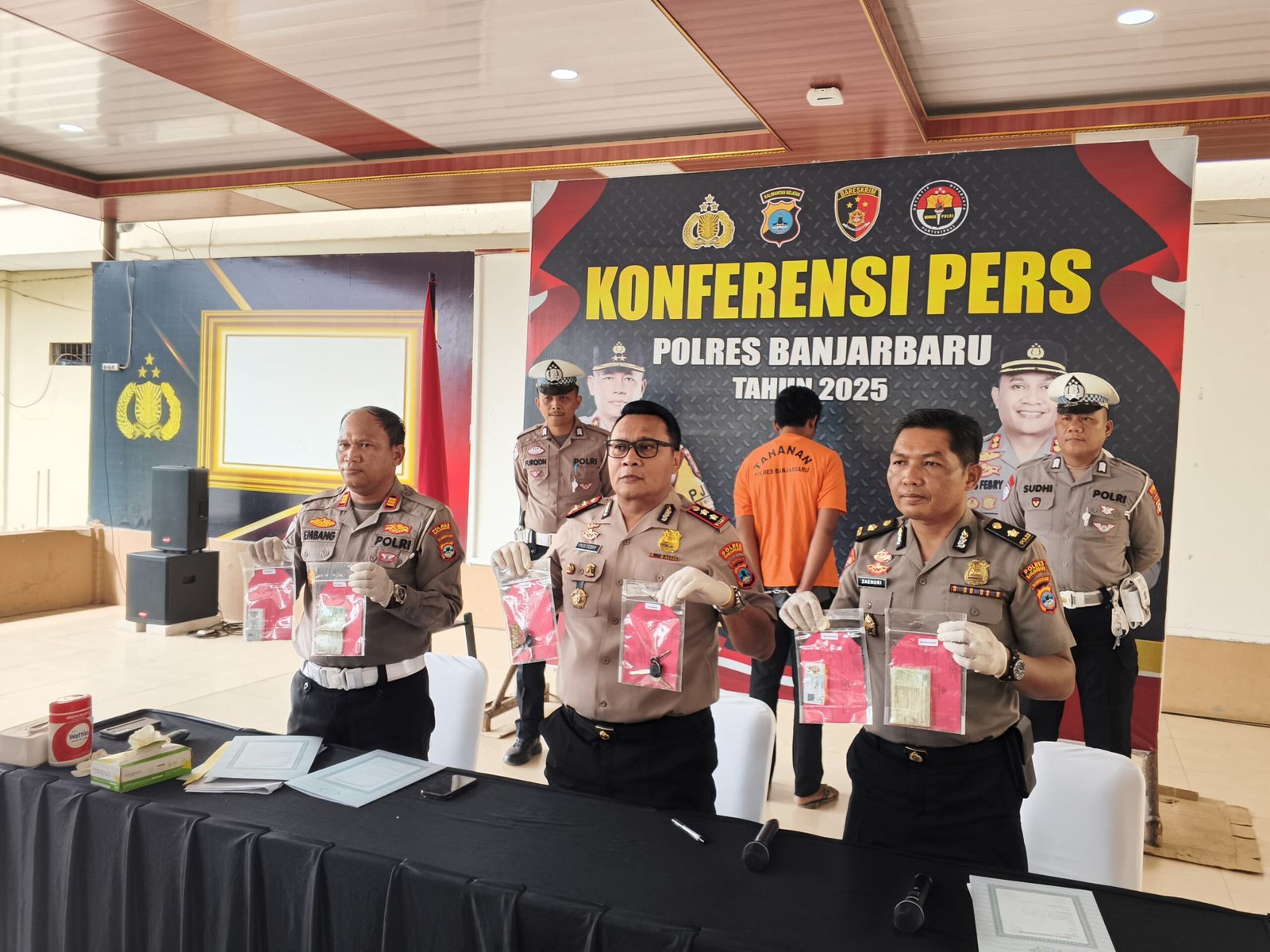 Kapolres Banjarbaru AKBP Pius X Febry Aceng Loda memperlihatkan barang bukti di konferensi pers. Foto – Raden