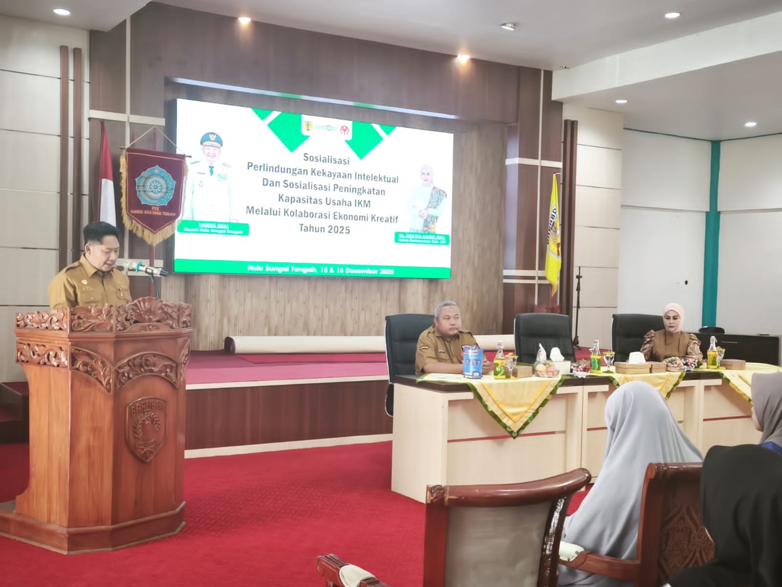 Hal itu disampaikan Bupati Hulu Sungai Tengah, Samsul Rizal, saat membuka kegiatan Sosialisasi Perlindungan Kekayaan Intelektual dan Peningkatan Kapasitas Usaha IKM melalui Kolaborasi Ekonomi Kreatif yang digelar di Gedung PKK lantai II HST, Rabu (29/10/2025).