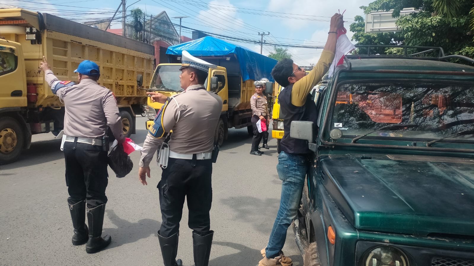 Satlantas Banjarbaru Edukasi Tertib Lalu Lintas Sambil Bagikan Bendera Merah Putih